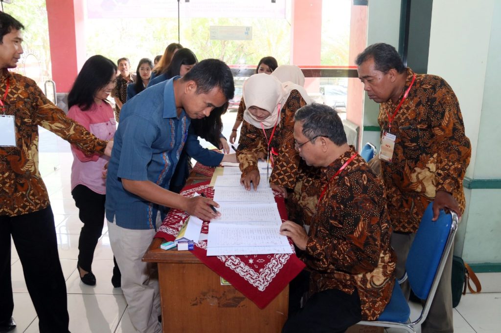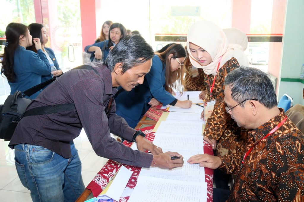 Para peserta Seminar yang melakukan regestrasi . Peserta Seminar terdiri dari para peneliti , dosen ISI Surakarta dan dari luar lingkup ISI Surakarta di antaranya dari ITB dan Univ Kristen Petra Surabaya.