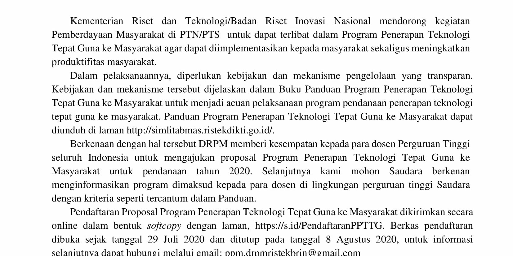 Jul302020Pengumuman Panduan-Program-Penerapan-Teknologi-Tepat-Guna-ke-Masyarakat-Tahun-2020Download Category: PengumumanBy LPPM ISI SurakartaJuly 30, 2020Post navigationPreviousPrevious post:Insentif Pendaftaran HKINextNext post:DAFTAR LOKASI DAN DPL KKN MAHASISWA ISI SURAKARTA TAHUN 2020