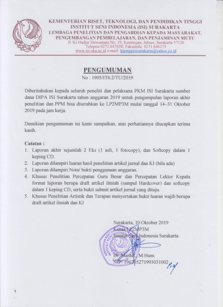 PENGUMPULAN LAPORAN AKHIR PENELITIAN DAN PPM ISI SURAKARTA 2019