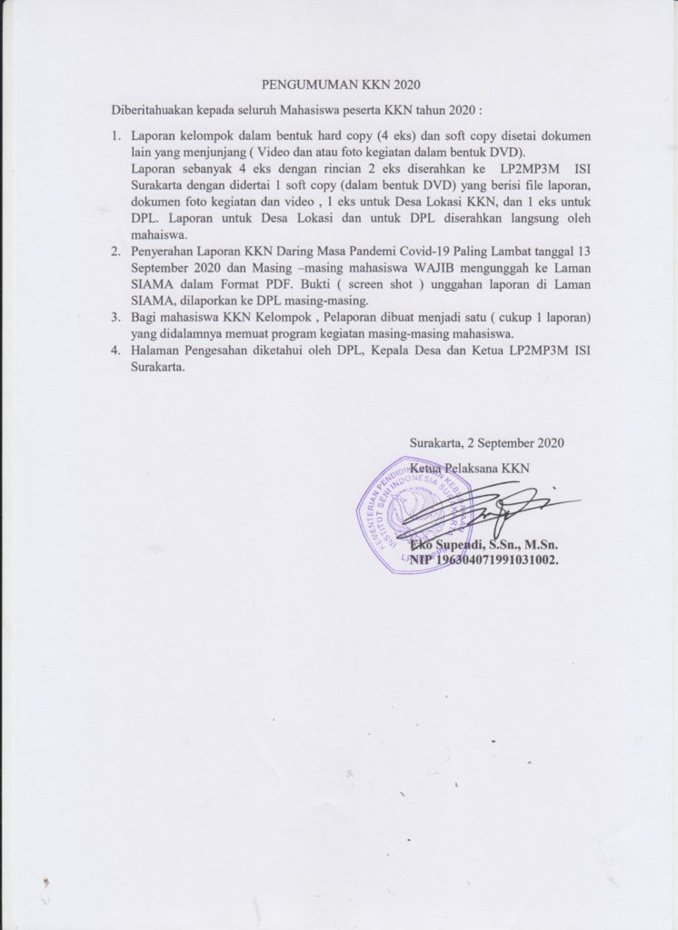 Sep142020Pengumuman Category: PengumumanBy LPPM ISI SurakartaSeptember 14, 2020Post navigationPreviousPrevious post:ISI Surakarta Melakukan Pengabdian pada Masyakat di Malam Apresiasi Puisi, Merdeka Covid dan Korupsi, RRI Pusat.NextNext post:Kewajiban unggah catatan harian, lap kemajuan dan SPTB