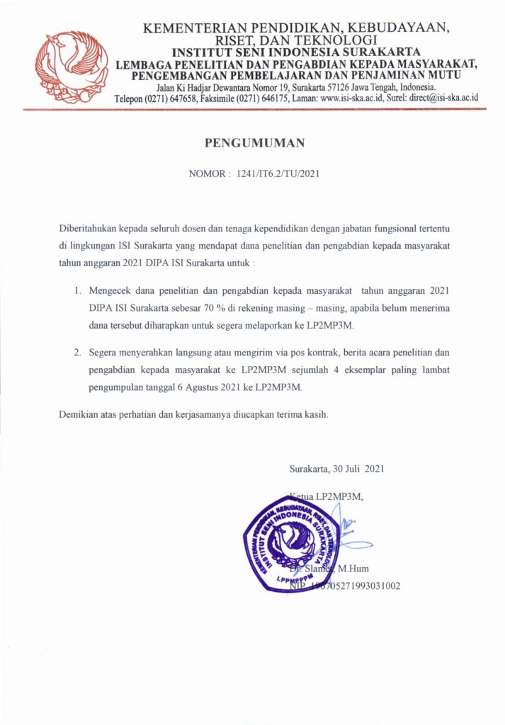 Category: PengumumanBy LPPM ISI SurakartaJuly 30, 2021Post navigationPreviousPrevious post:Pengumuman Pemenang Penelitian dan PKM DIPA ISI Surakarta 2021NextNext post:PANDUAN PROGRAM RISET KEILMUAN (lpdp)