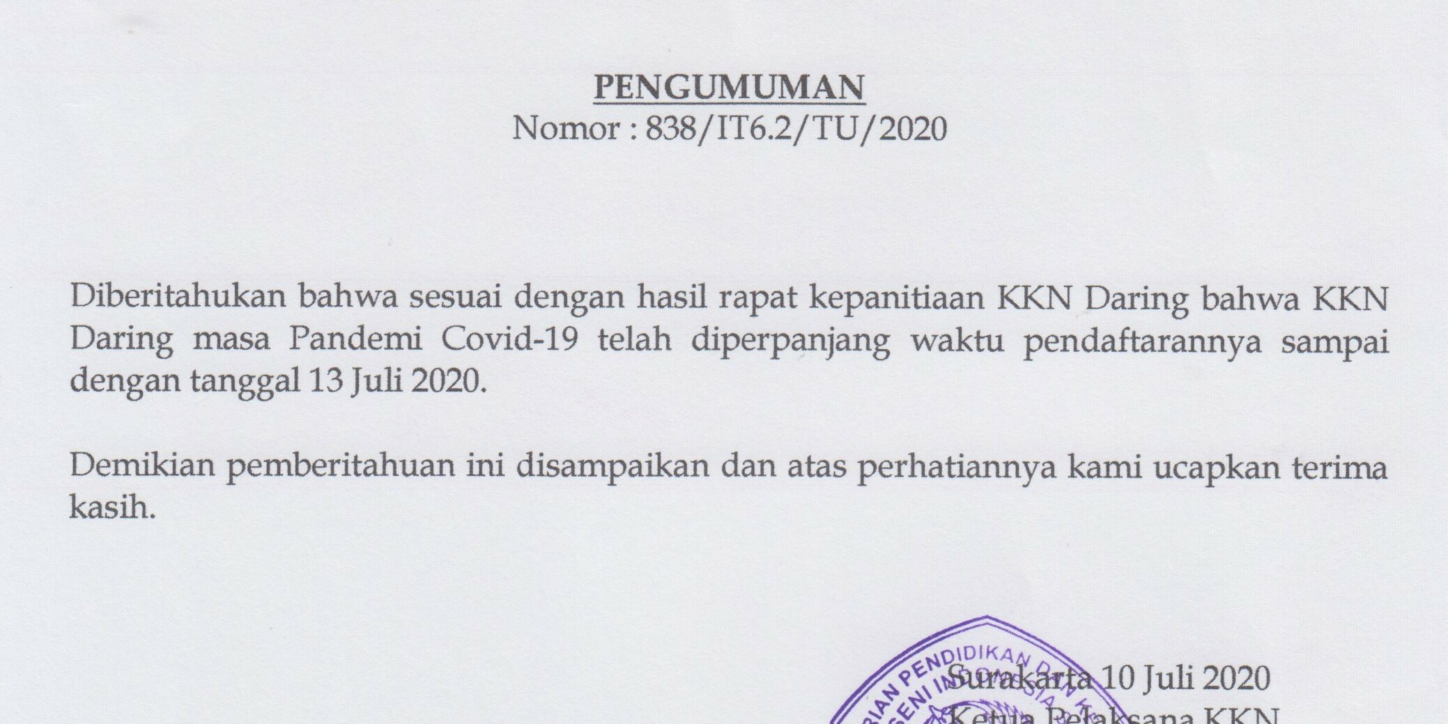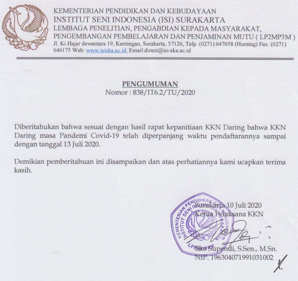 Jul102020Pengumuman Category: PengumumanBy LPPM ISI SurakartaJuly 10, 2020Post navigationPreviousPrevious post:Pengumuman Diktendik Berprestasi 2020 ISI SurakartaNextNext post:SURAT PERNYATAAN KESANGGUPAN SEBAGAI DOSEN PEMBIMBING LAPANGAN KKN DARING MASA PANDEMI COVID-19 MAHASISWA ISI SURAKARTA TAHUN AJARAN 2019/2020
