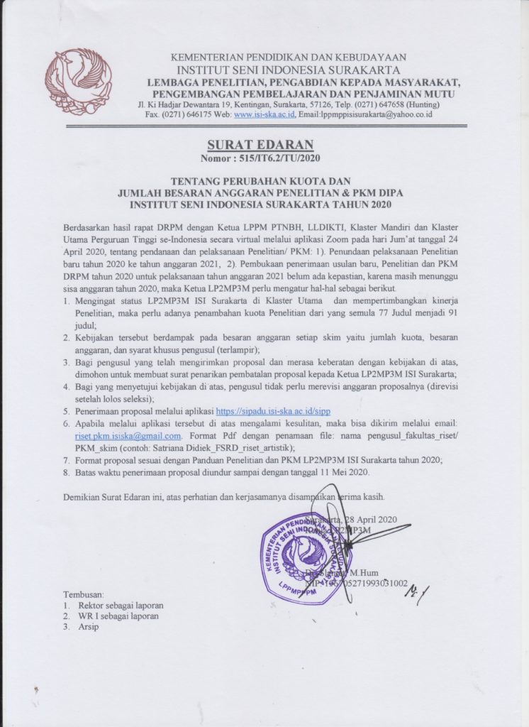 Surat-Edaran-Tentang-Perubahan-Kuota-dan-Jumlah-Besaran-Anggaran-Penelitian-dan-PKM-DIPA-ISI-Ska-2020Download Category: PengumumanBy LPPM ISI SurakartaApril 29, 2020Post navigationPreviousPrevious post:Surat Edaran Keputusan Hasil Virtual Metting BRIN dan LP2MP3M tentang Penelitian dan PKM DRPMNextNext post:Penawaran Program Pengembangan Profesi Pranata Laboratorium Pendidikan (PLP)